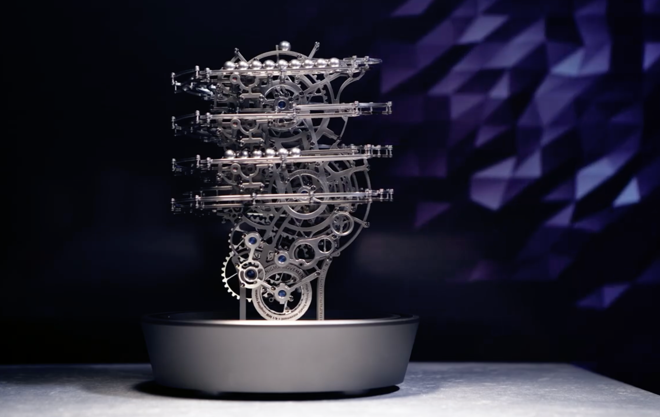 You will not find any numbers on this clock. Instead, the time is represented by the groups of balls that collect on the various levels of the railing. Each metal orb rides up and around through the complex mechanism until it is rolled into place at exactly the right moment and arrives in position with a satisfying click. When the clock strikes 1:00, a cascade of silver balls swirls down through the railings until they come to rest on the lowermost rung. There, another twelve-hour journey to the top will begin.