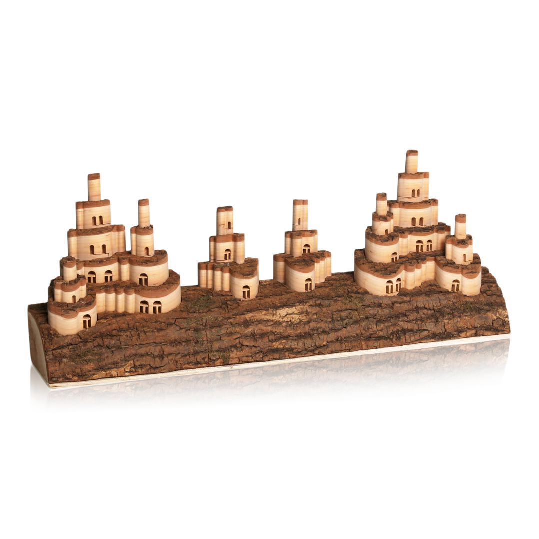 This intricately cut log hides a hidden fairy kingdom. Shake the log up and down and the telescoping towers seem to appear out of thin air. A whimsical piece of traditional craftsmanship that looks delightful on display but is even more fun to demonstrate for someone who is not expecting the surprise.