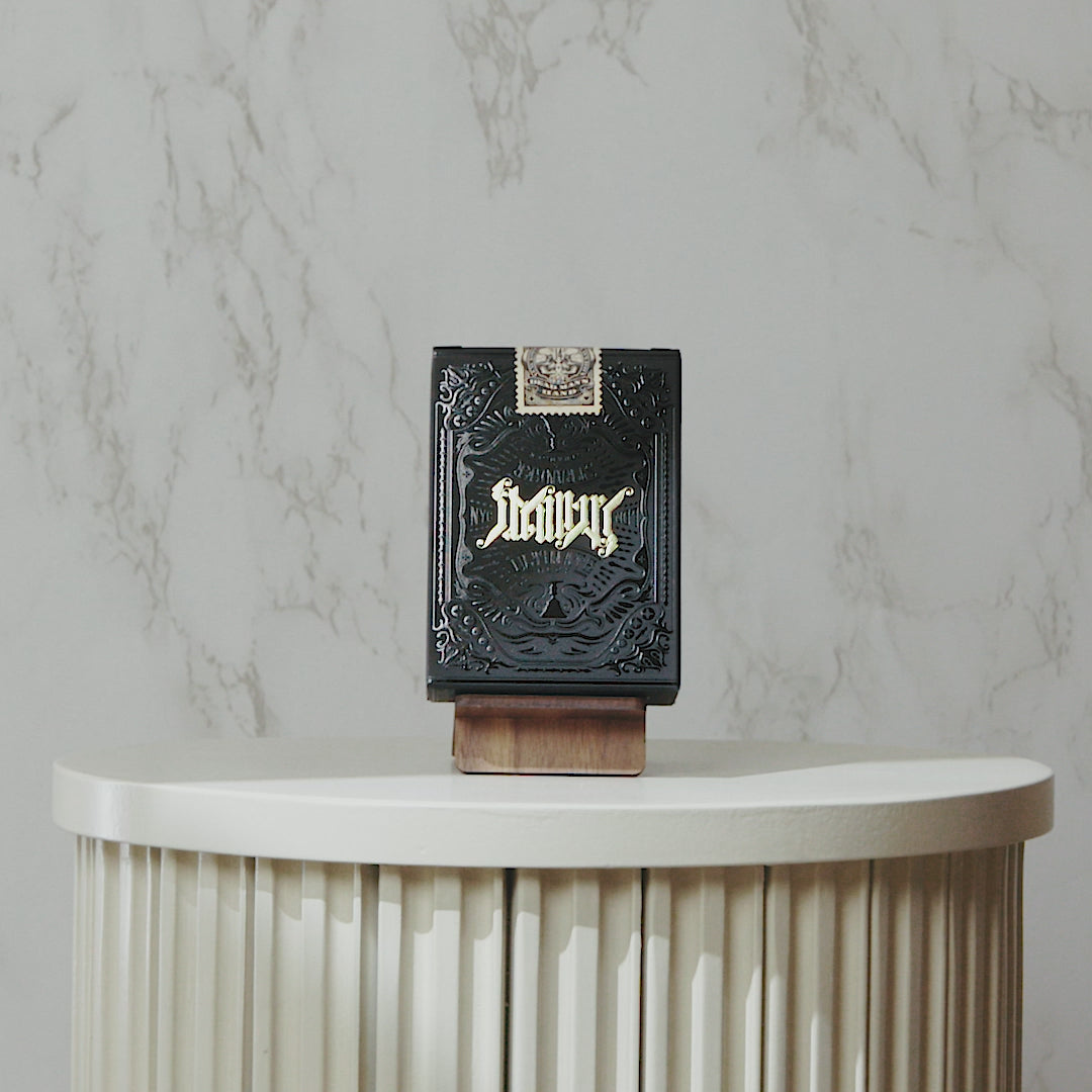 Packaged in a gorgeous tuck-case of extraordinary detail featuring embossed elements and foil accents. Each deck is carefully packaged by hand and sealed with a vintage-inspired tax stamp.